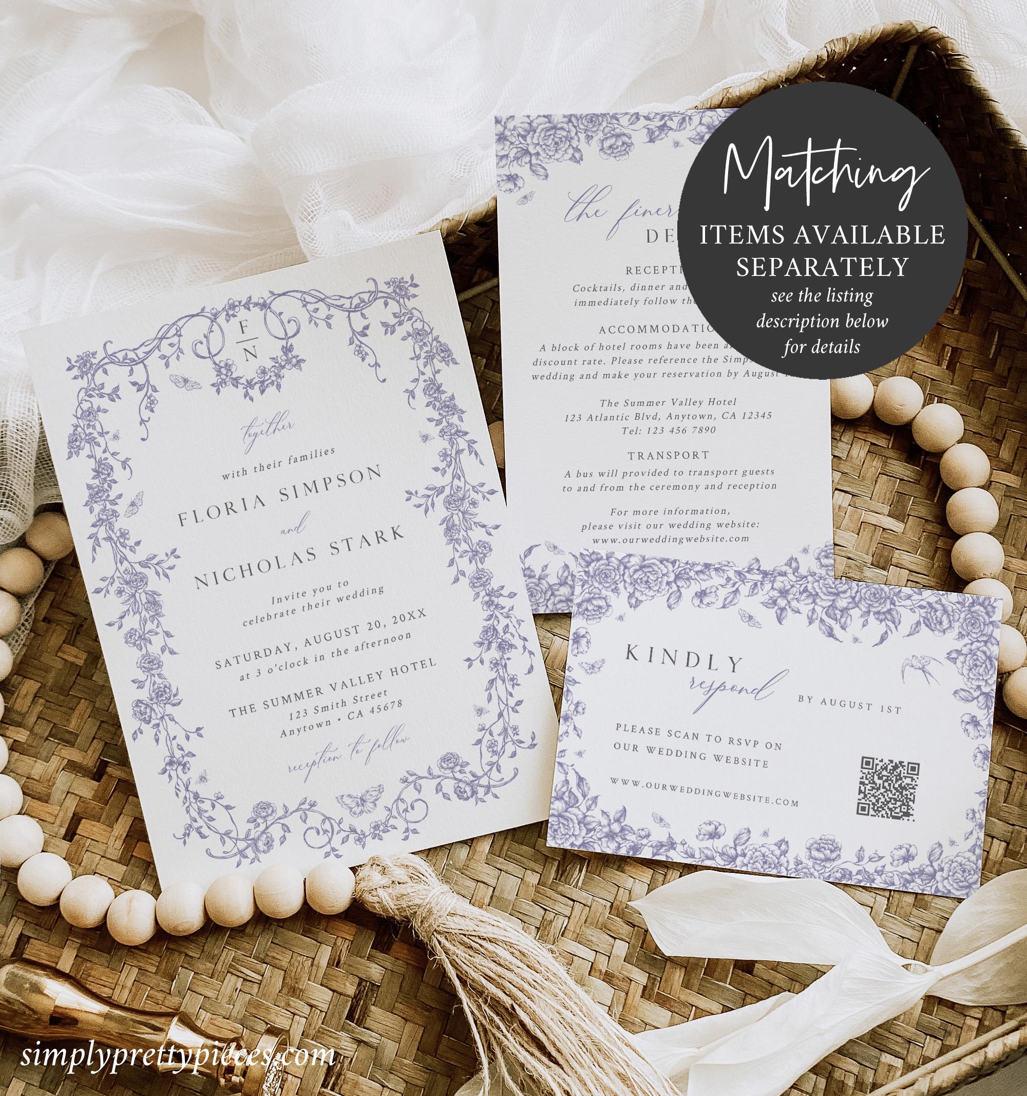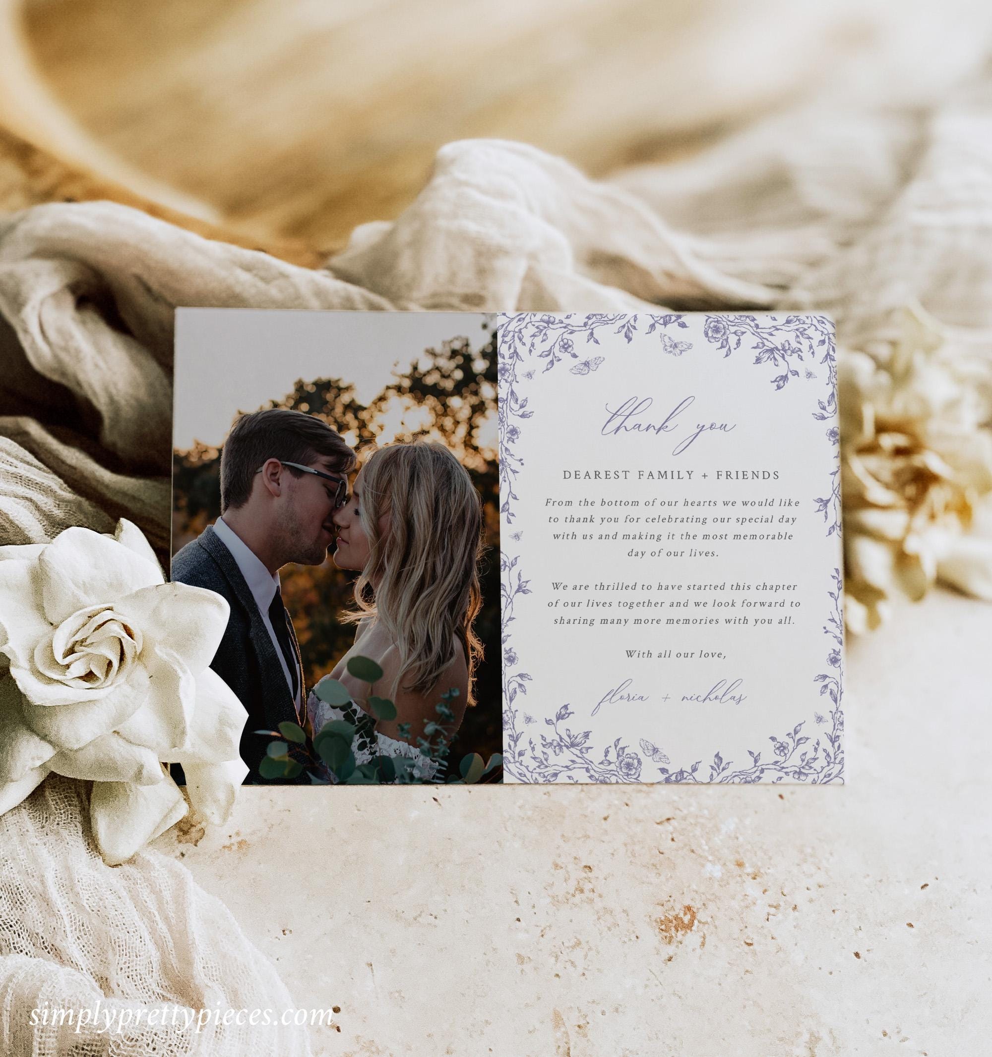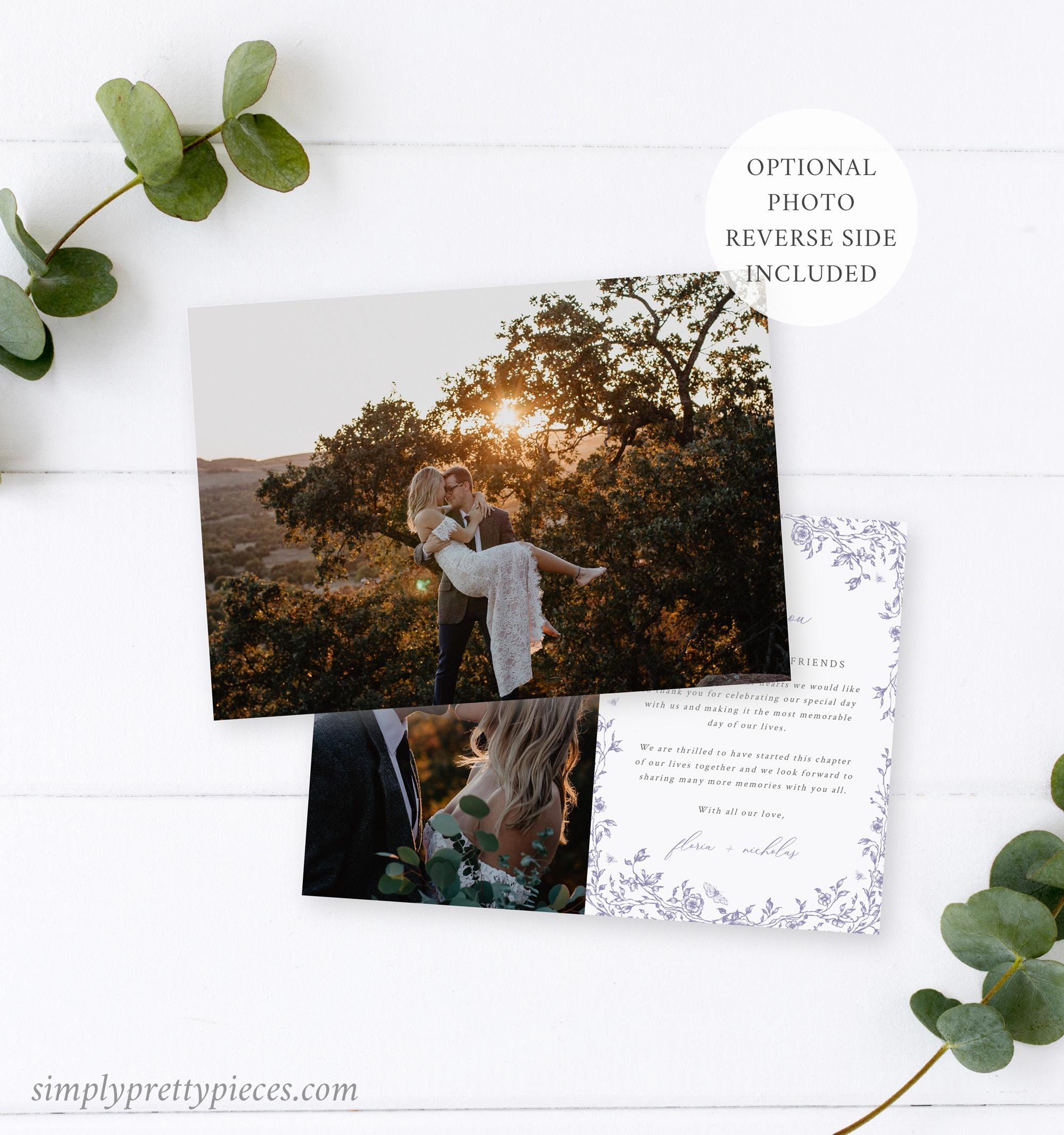 Toile photo thank you card template that features chinoiserie graphics, a soft dusty lilac color palette and a modern calligraphy font. You can add your own photos and edit the thank you message as you require. Two sizes are included and this lovely way to send your thanks along with some wedding photos.