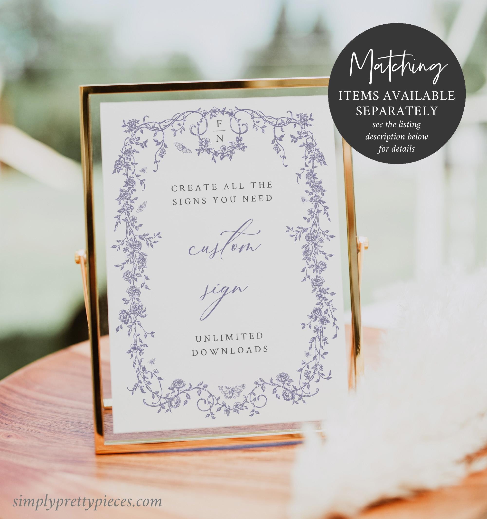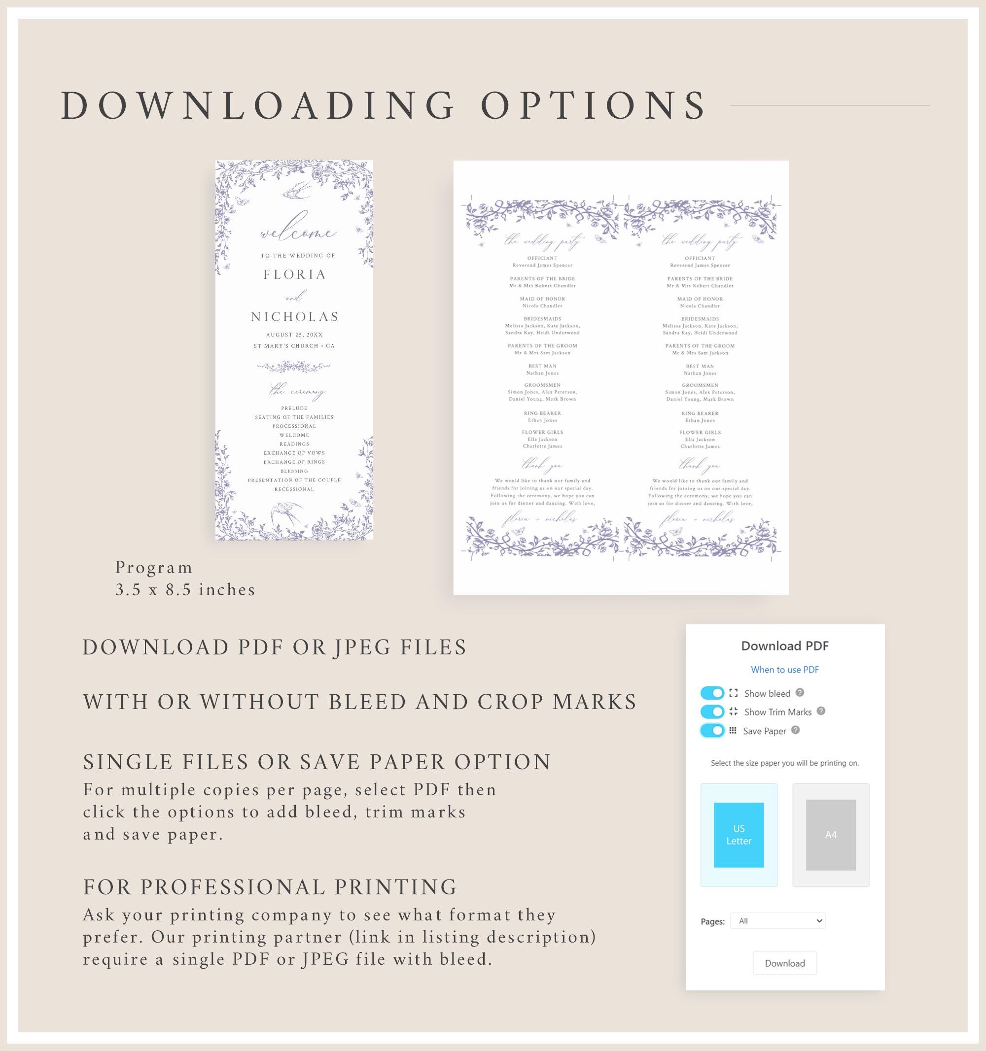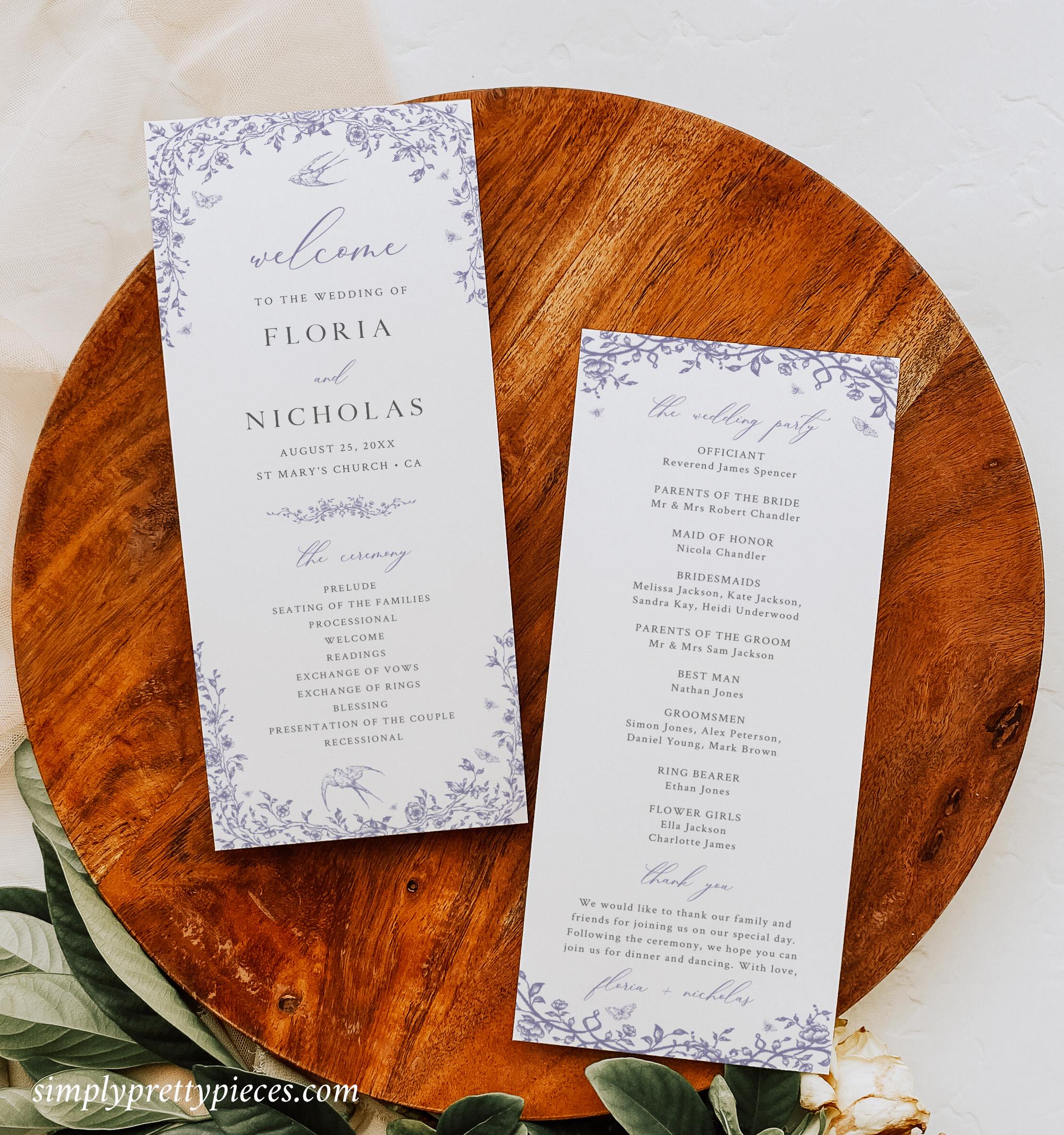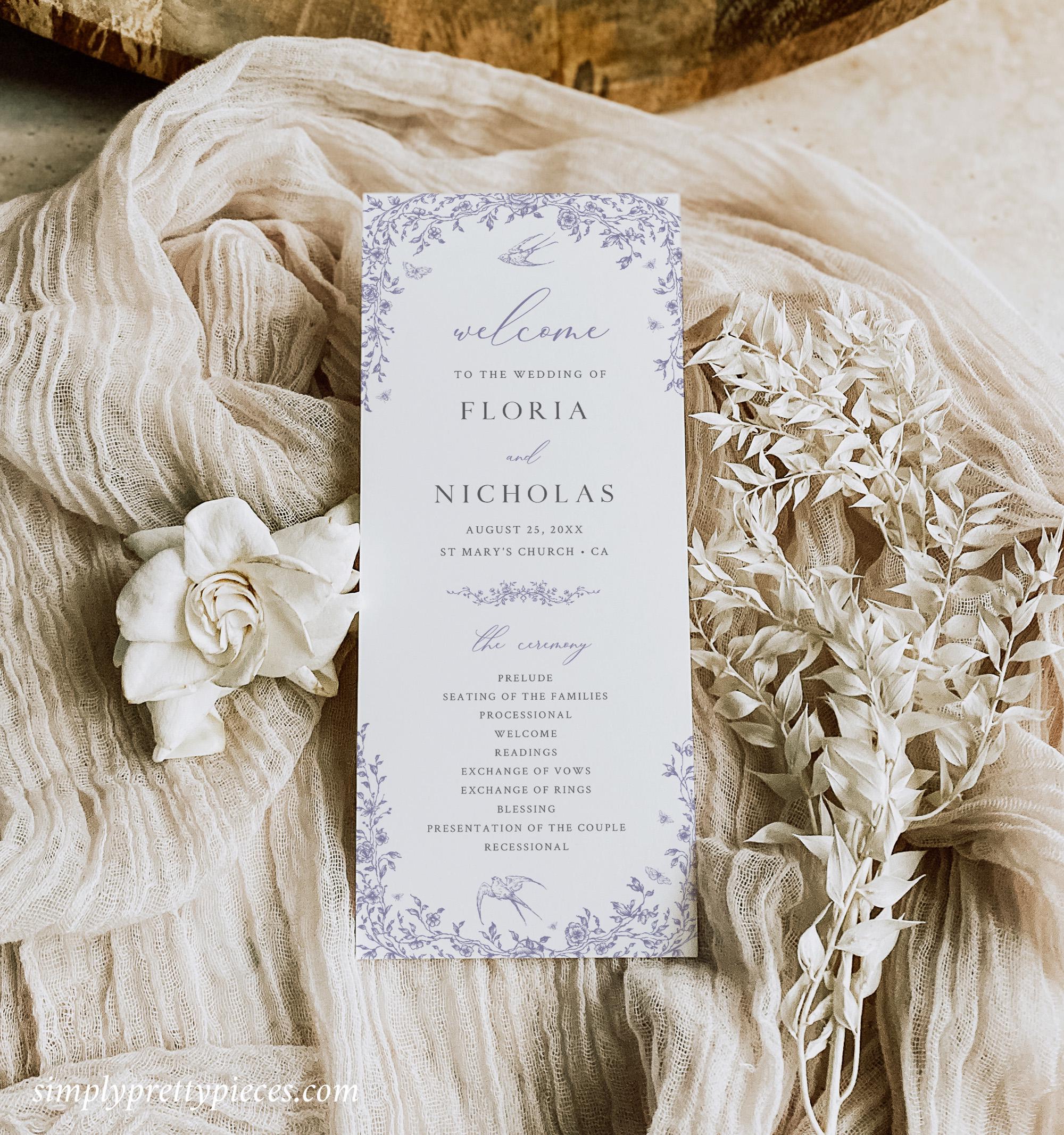 Printable chinoiserie wedding program template that has a toile de jouy design, a soft dusty lilac color palette and a modern calligraphy font. This order of service is easy to edit and print and would be perfect for a french floral or regency-themed wedding.